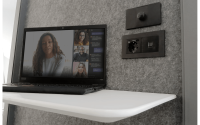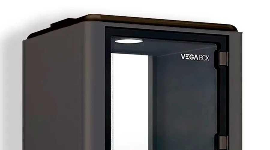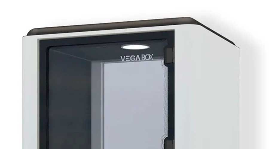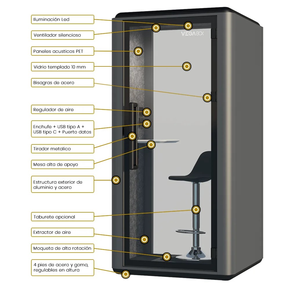 La cabina telefónica insonorizada VEGA está Completamente equipada con mesa, conexiones de carga, ventilación e iluminación.