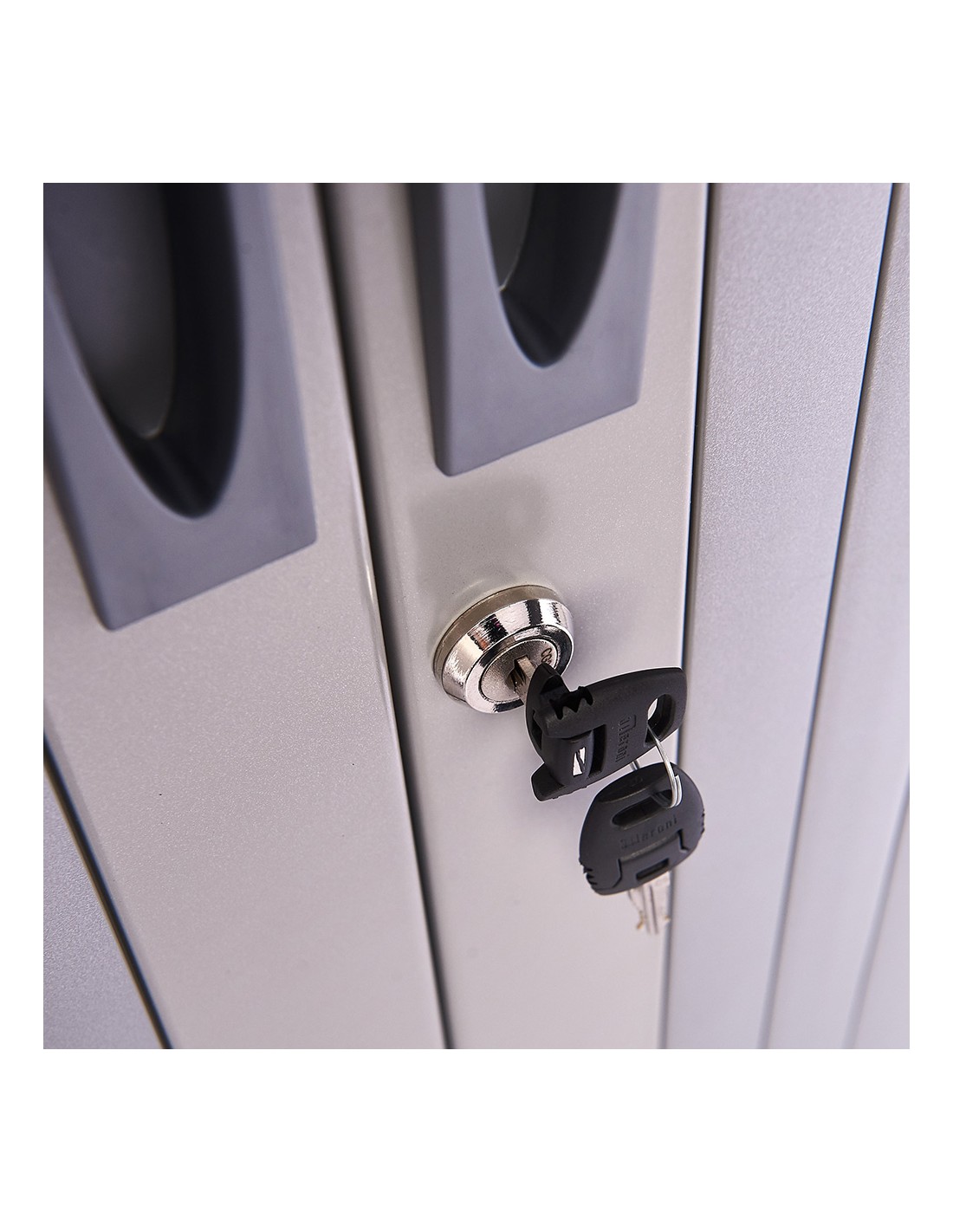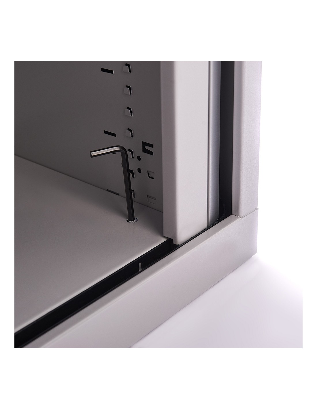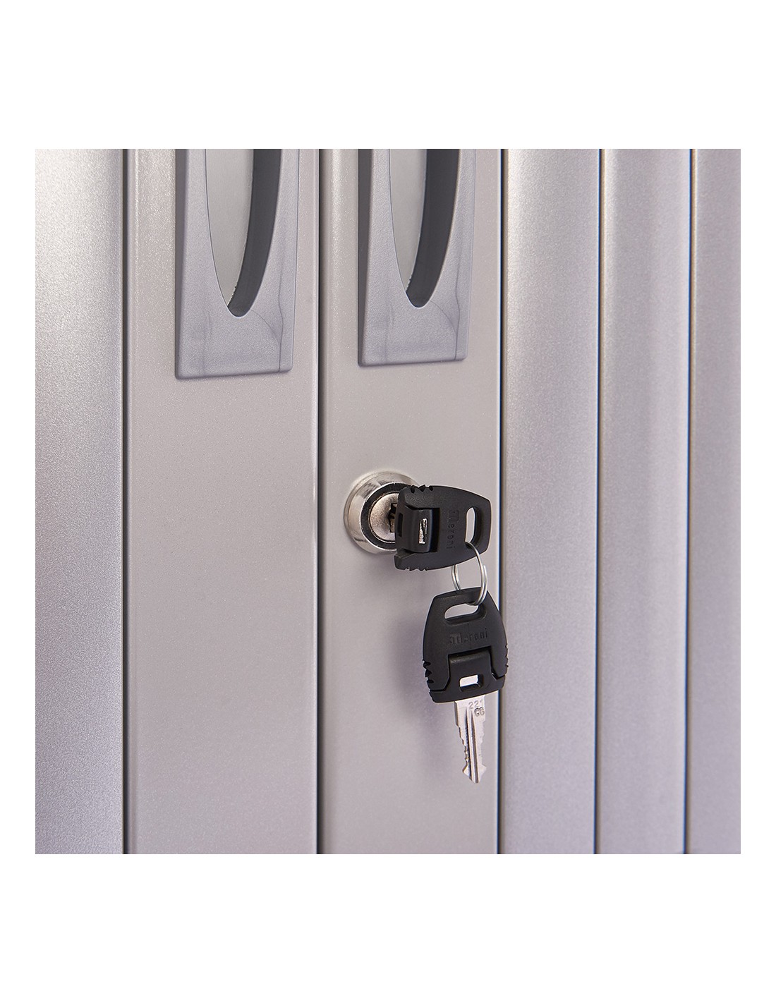 Familia de armarios metálicos de gran resistencia y calidad. Solución perfecta para el almacenamiento y clasificación de archivos y documentos. Los armarios incorporan niveladores realizados en plancha de acero. Puertas de persiana con cerradura realizadas en polímero técnico y baldas metálicas regulables en altura incluidas (admiten archivar con carpetas colgantes tamaño DIN A4). Pintados en epoxy, color según modelo. Se entregan montados de serie.