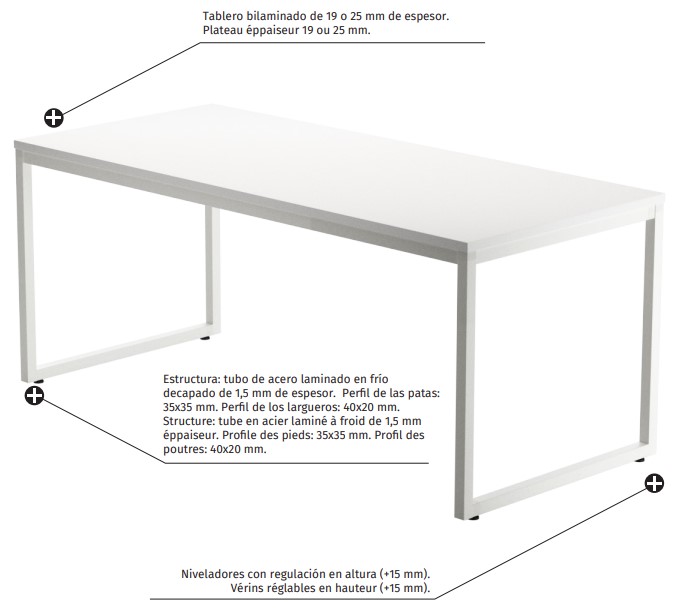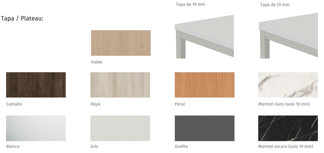 Bilaminado: Tablero de partículas con recubrimiento de melamina de 19 mm de espesor. Cantos termofusionados de 1 mm de espesor. Varios acabados. Fijación a la mesa mediante herrajes específicos.