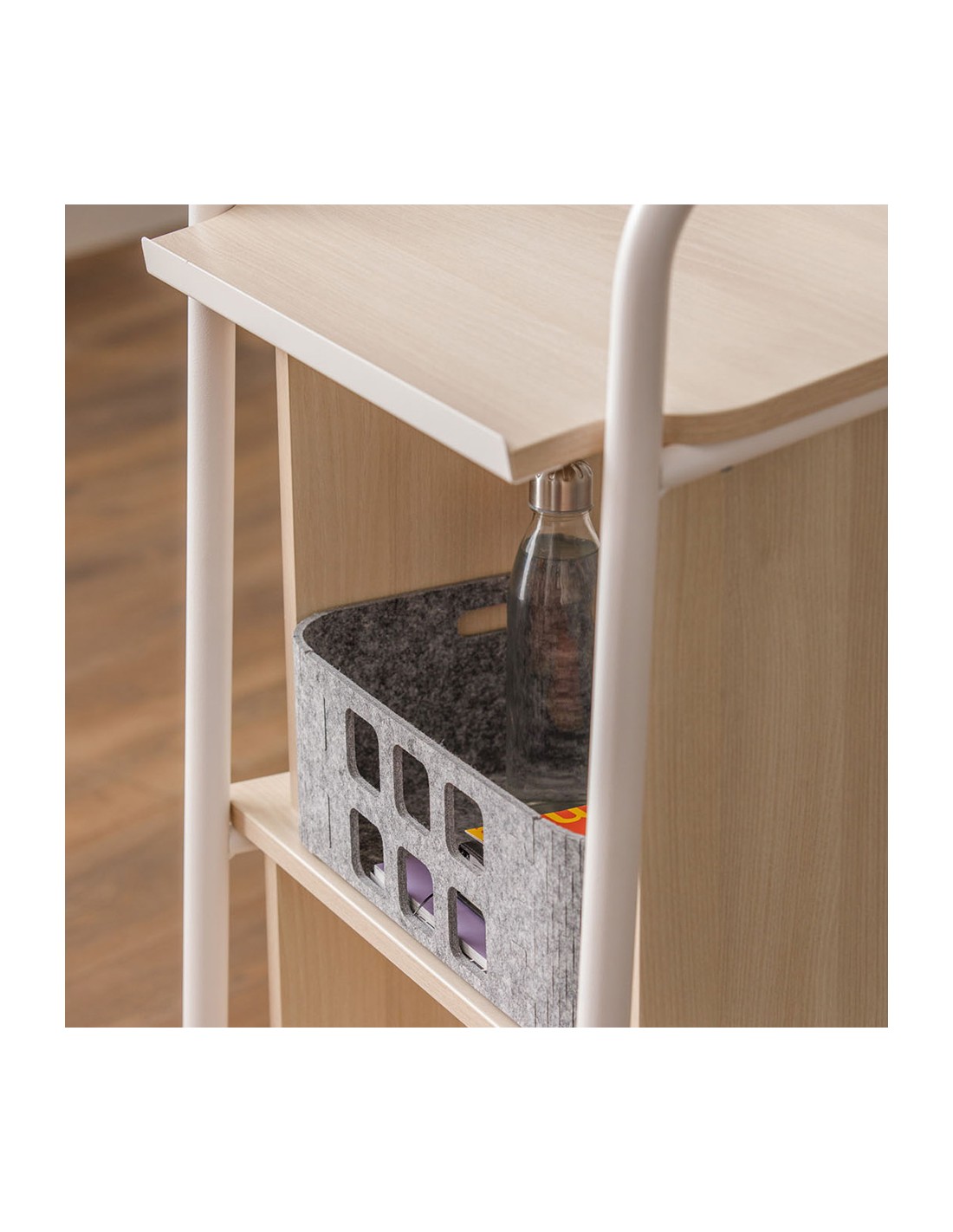 | Sobre, bajo, laterales y estante central: están fabricados con tablero aglomerado de partículas de 19 mm de grosor con recubierto melamínico de 120 g/m2 por ambas caras y una densidad de 630 ± 5 kg/m 3. Los cantos exterioes son de ABS de 0,8 y 2 mm de grosor aplicados con cola termofusible y con aristas redondeadas. |