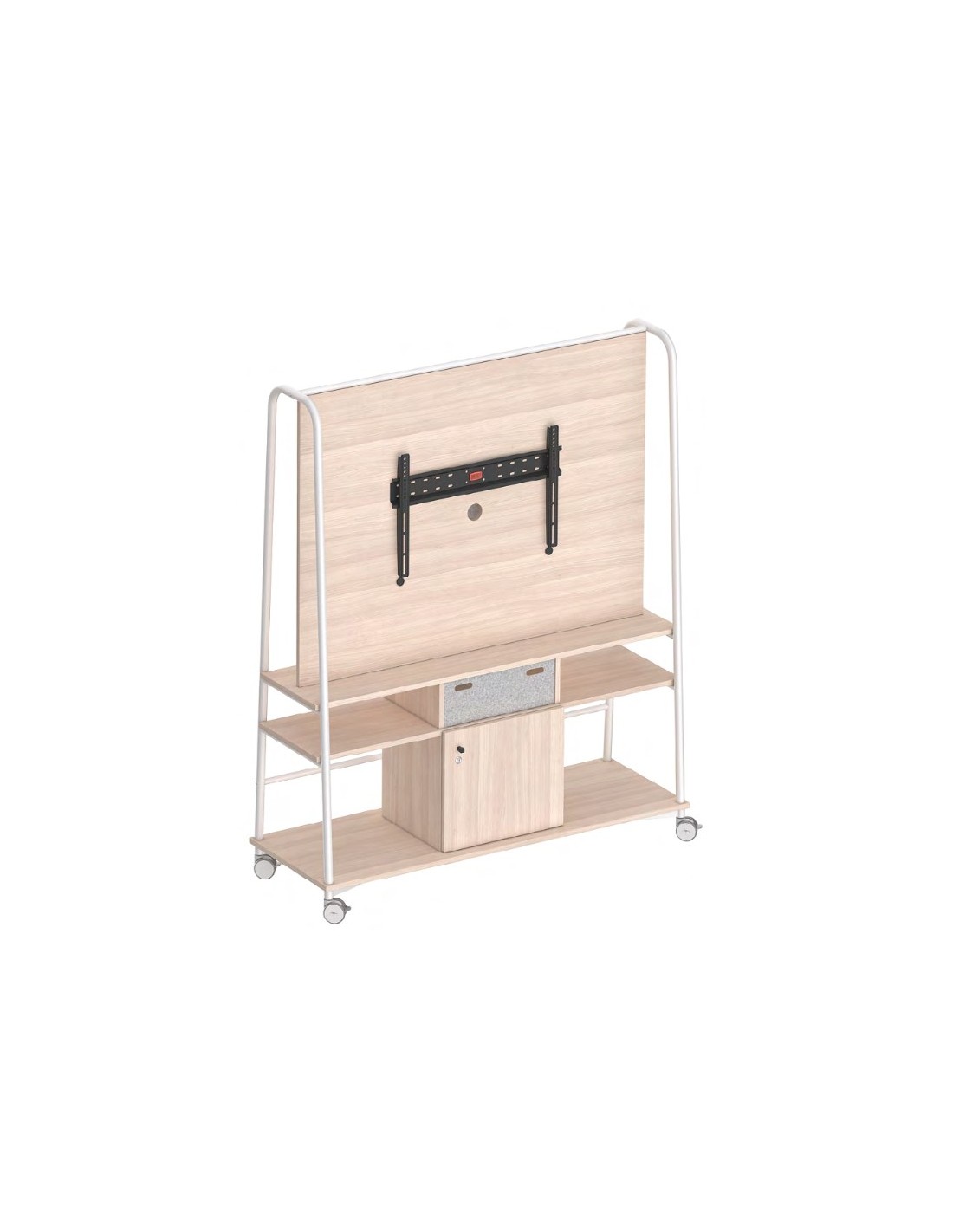 Sobre, bajo, laterales y estante central y panel vertical para pantalla: están fabricados con tablero aglomerado de partículas de 19 mm de grosor con recubierto melamínico de 120 g/m2 por ambas caras y una densidad de 630 ± 5 kg/m 3.