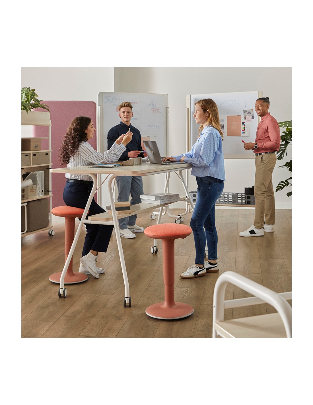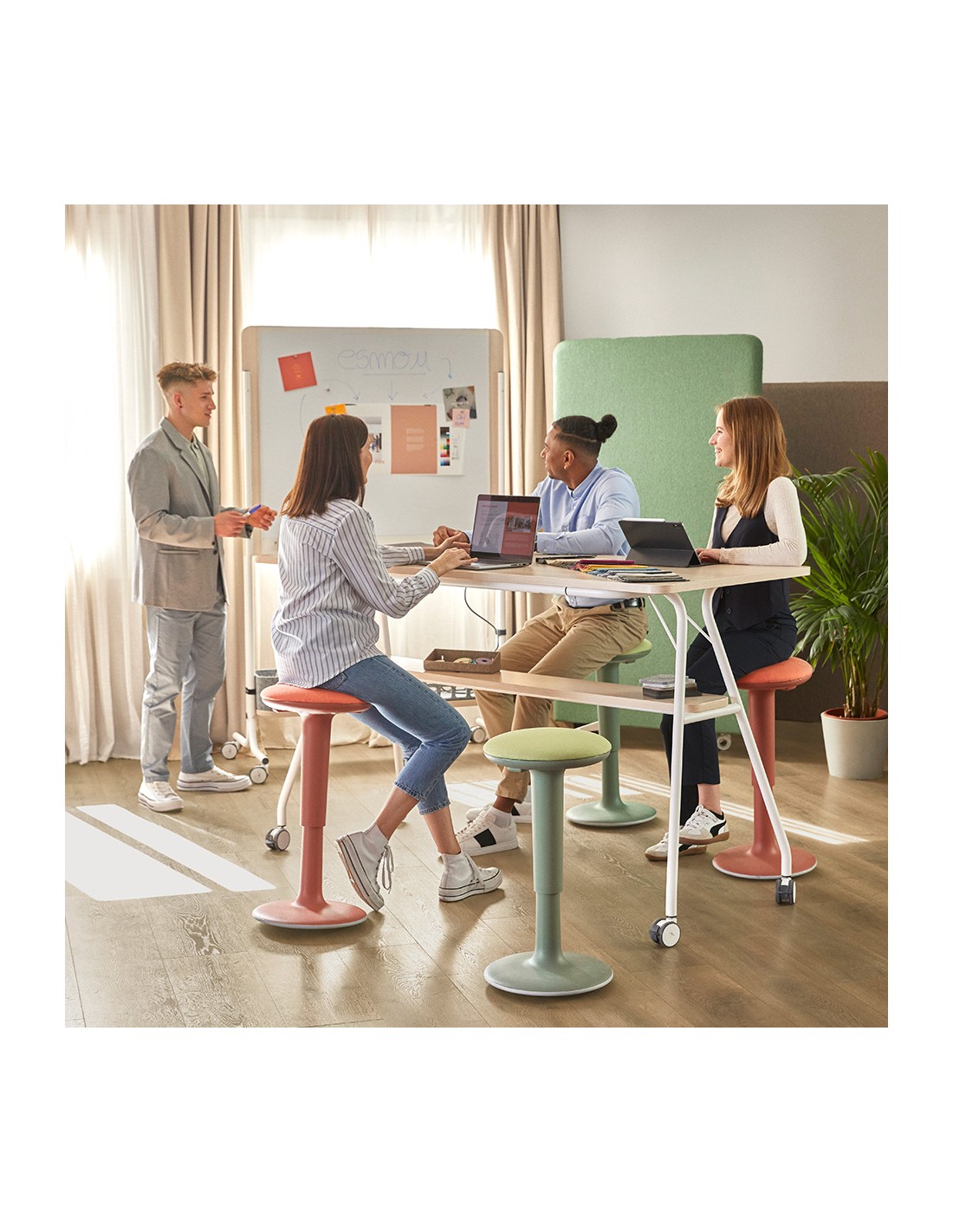 Esta mesa alta con ruedas está diseñada para espacios profesionales que requieren flexibilidad y movilidad. Es una solución ideal para oficinas modernas, aulas de formación, salas polivalentes y espacios de coworking.