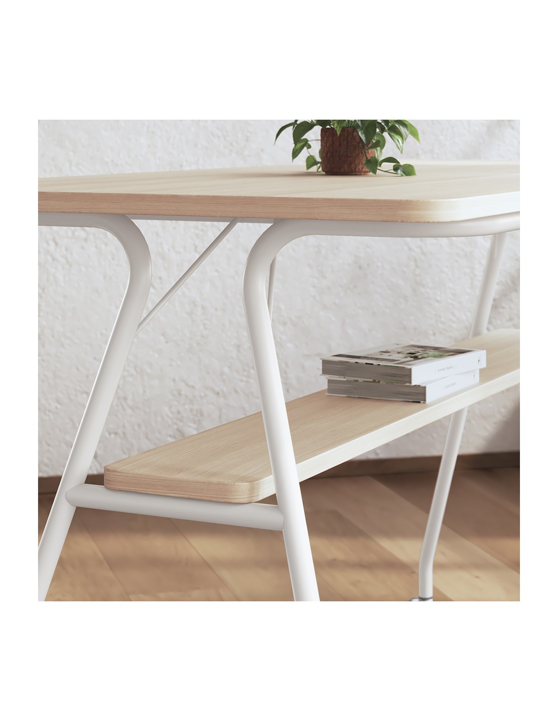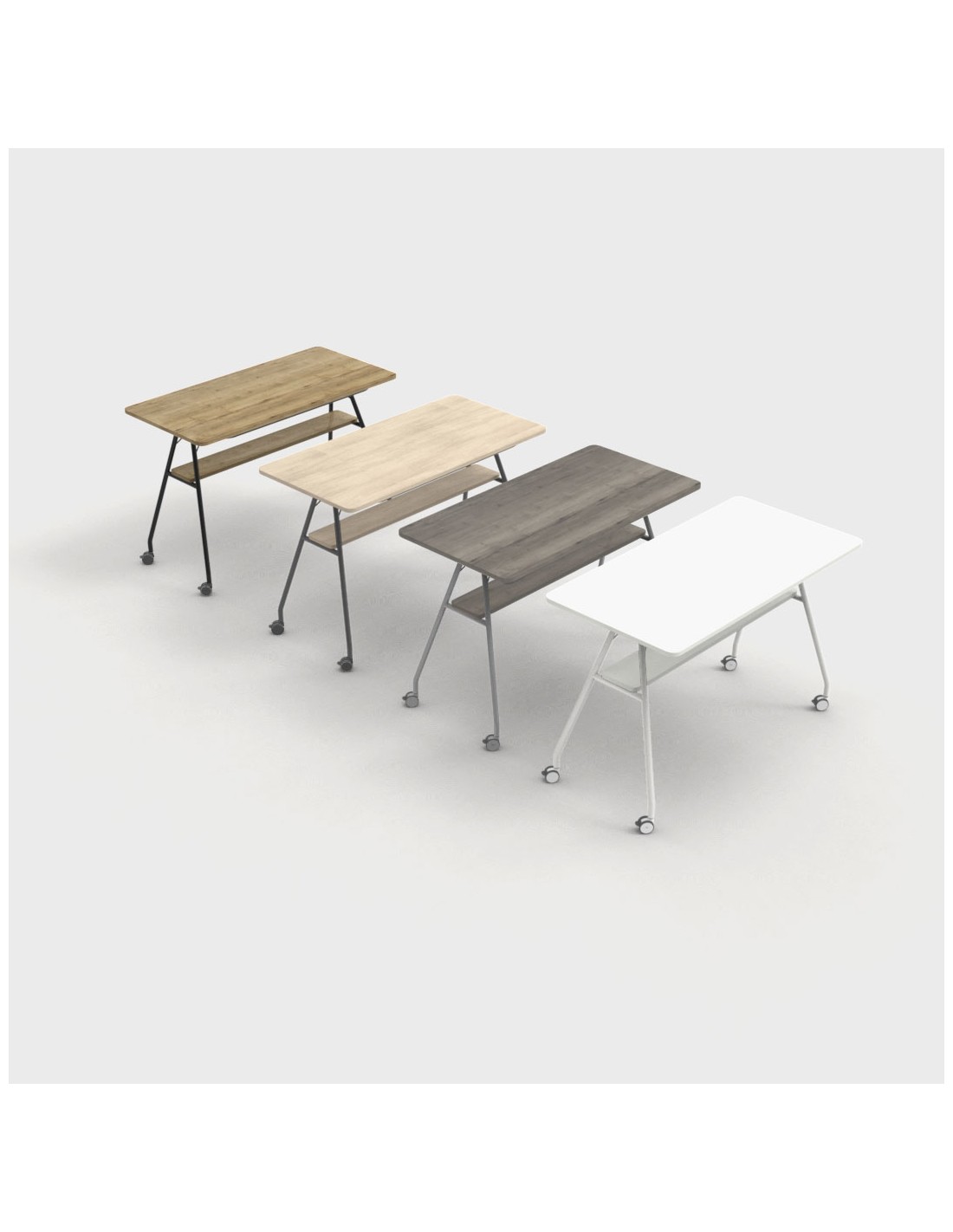 Gracias a sus ruedas con freno, permite reorganizar el espacio fácilmente sin renunciar a estabilidad. Está disponible en tres medidas —120, 160 y 180 cm— y en distintos acabados de estructura y melamina, adaptándose a diferentes necesidades estéticas y funcionales.