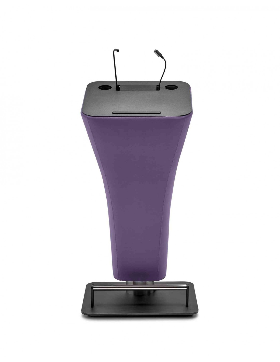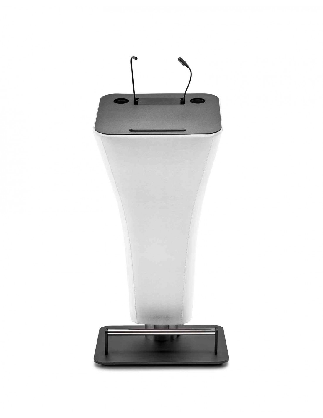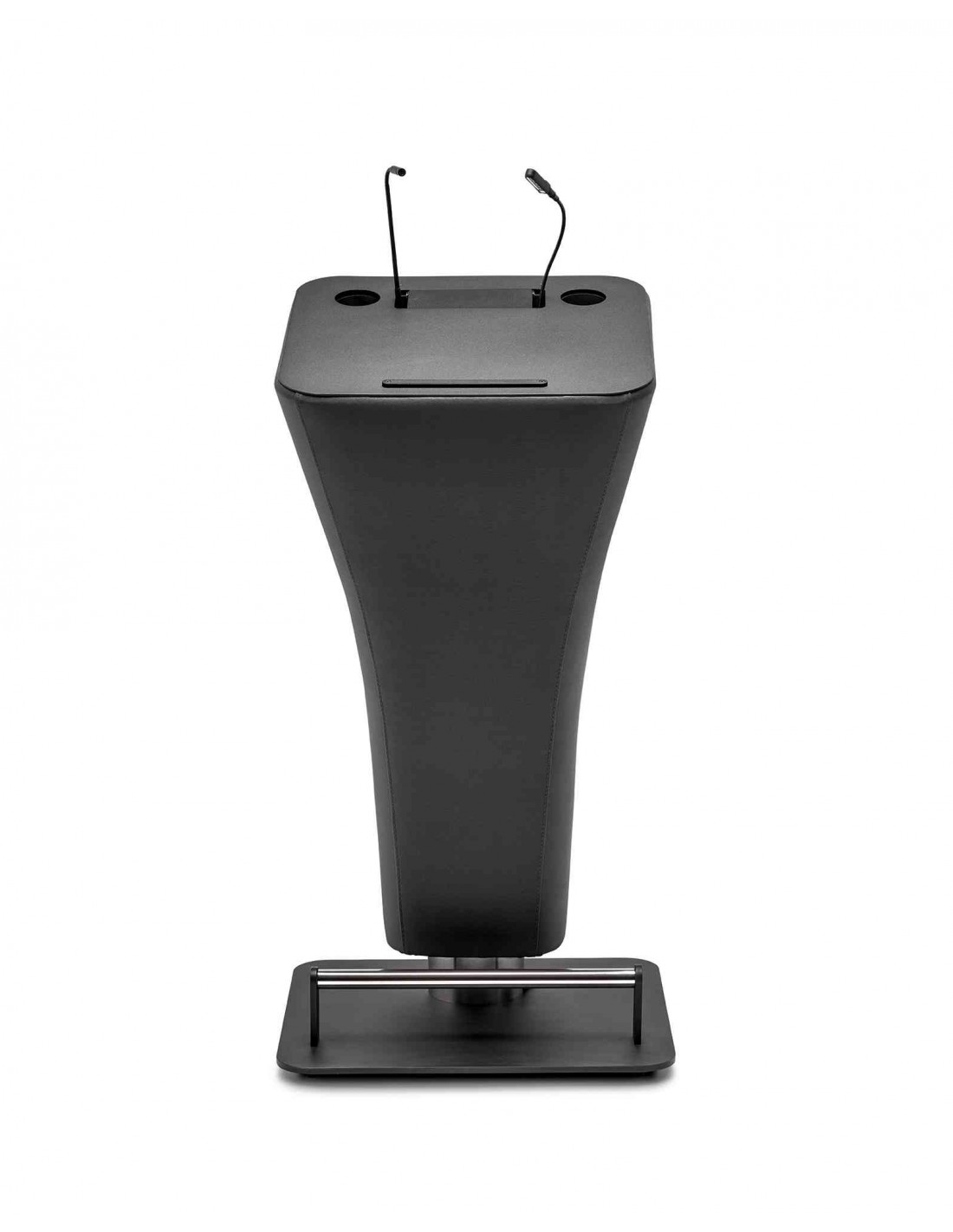 Atril para conferencias fabricado mediante un núcleo de polietileno rotacional tapizado. Base metálica en chapa de hierro de 10 mm. Disponible versión electrificada que incluye un cajetín que contiene una regleta con dos tomas de corriente, una base para micrófono y/o luz. IncoRpora reposa-vasos y barra sujeta documentos. Barra reposa-pies en acero inoxidable. Cable eléctrico de 2 m.