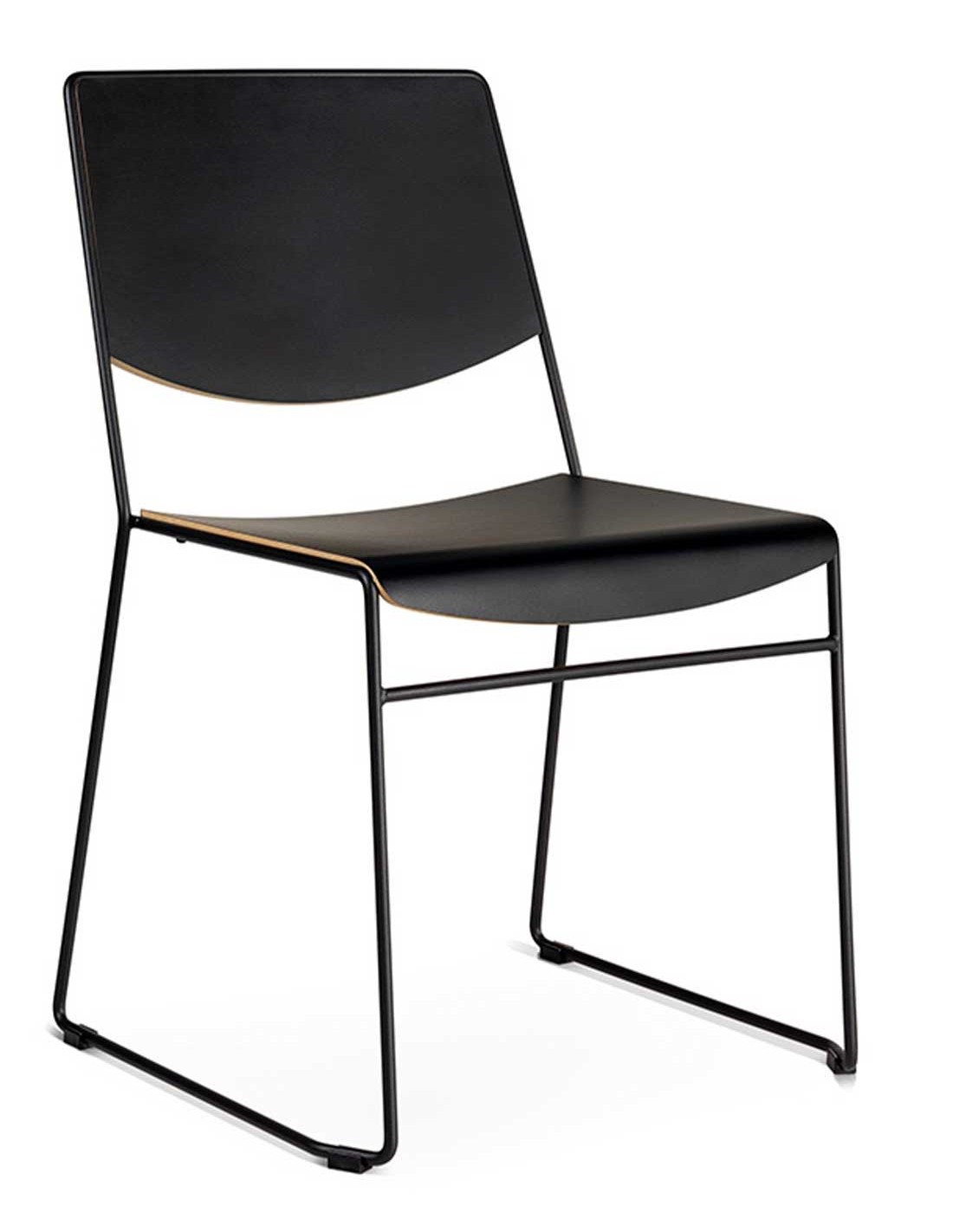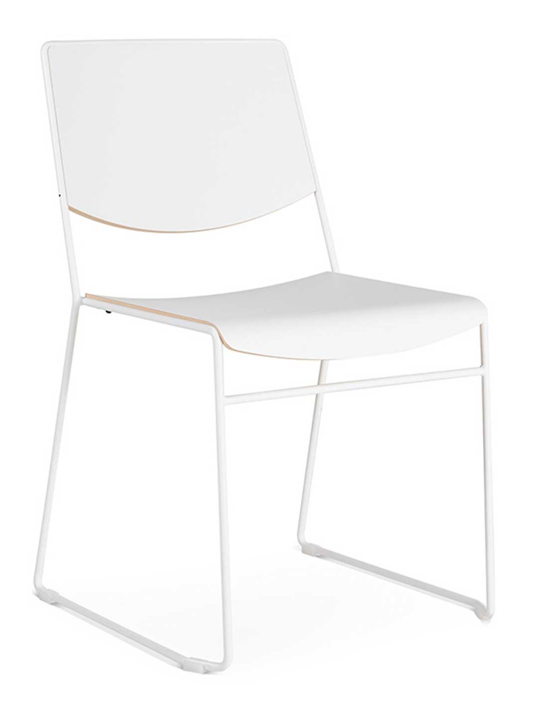 Silla confidente de oficina apilable con estructura de patín y con el asiento y el respaldo realizado en madera de haya con certificado FSC 100%. Estructura metálica pintada en epoxy color según modelo.