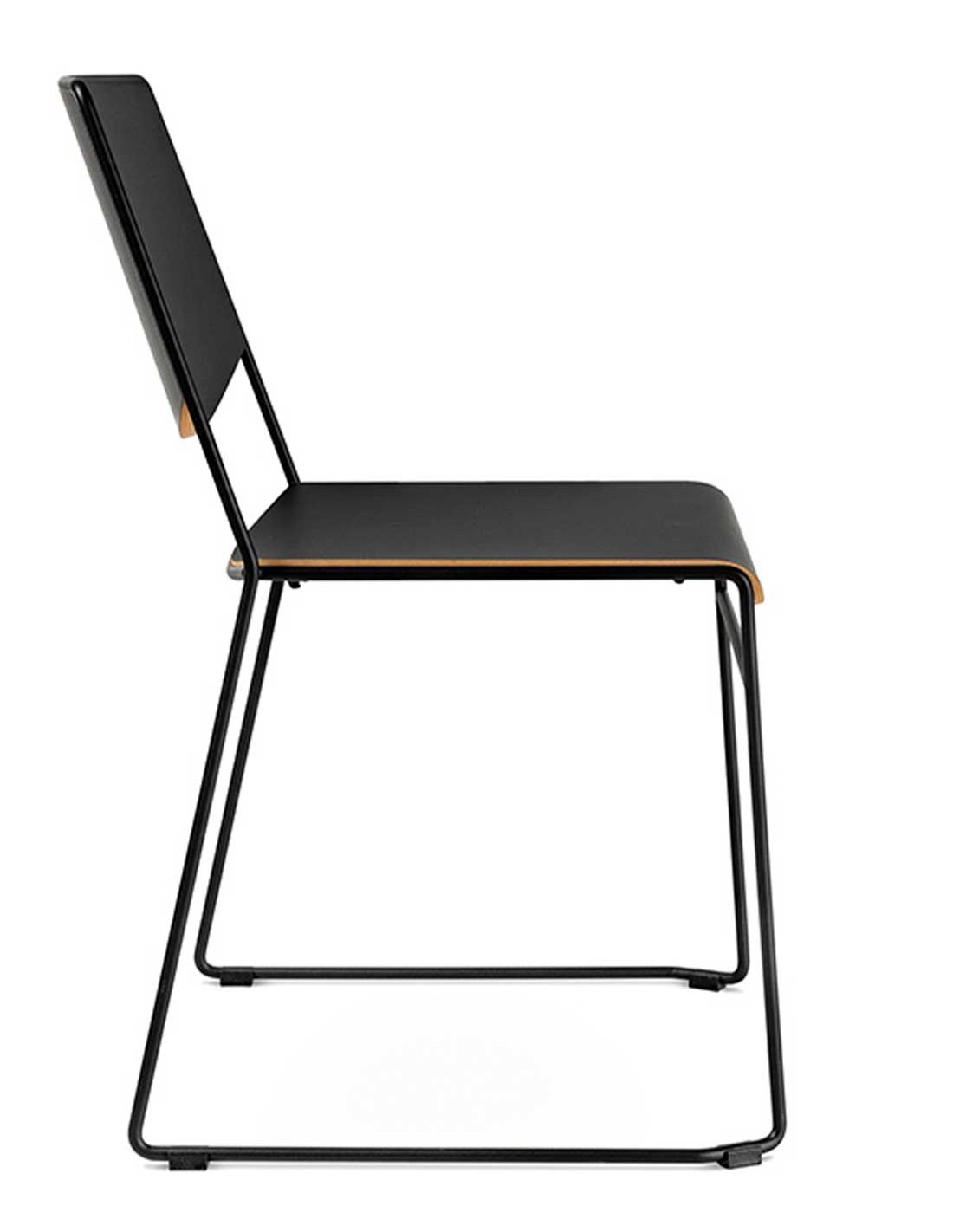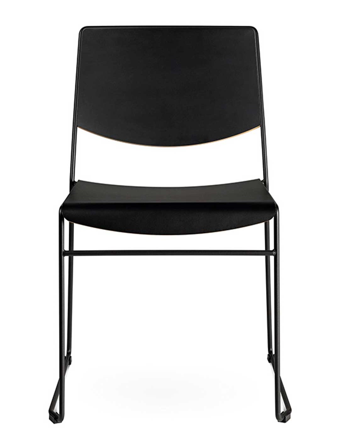 Silla confidente de oficina apilable con estructura de patín y con el asiento y el respaldo realizado en madera de haya con certificado FSC 100%. Estructura metálica pintada en epoxy color según modelo.