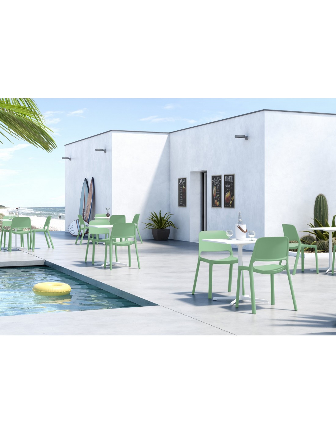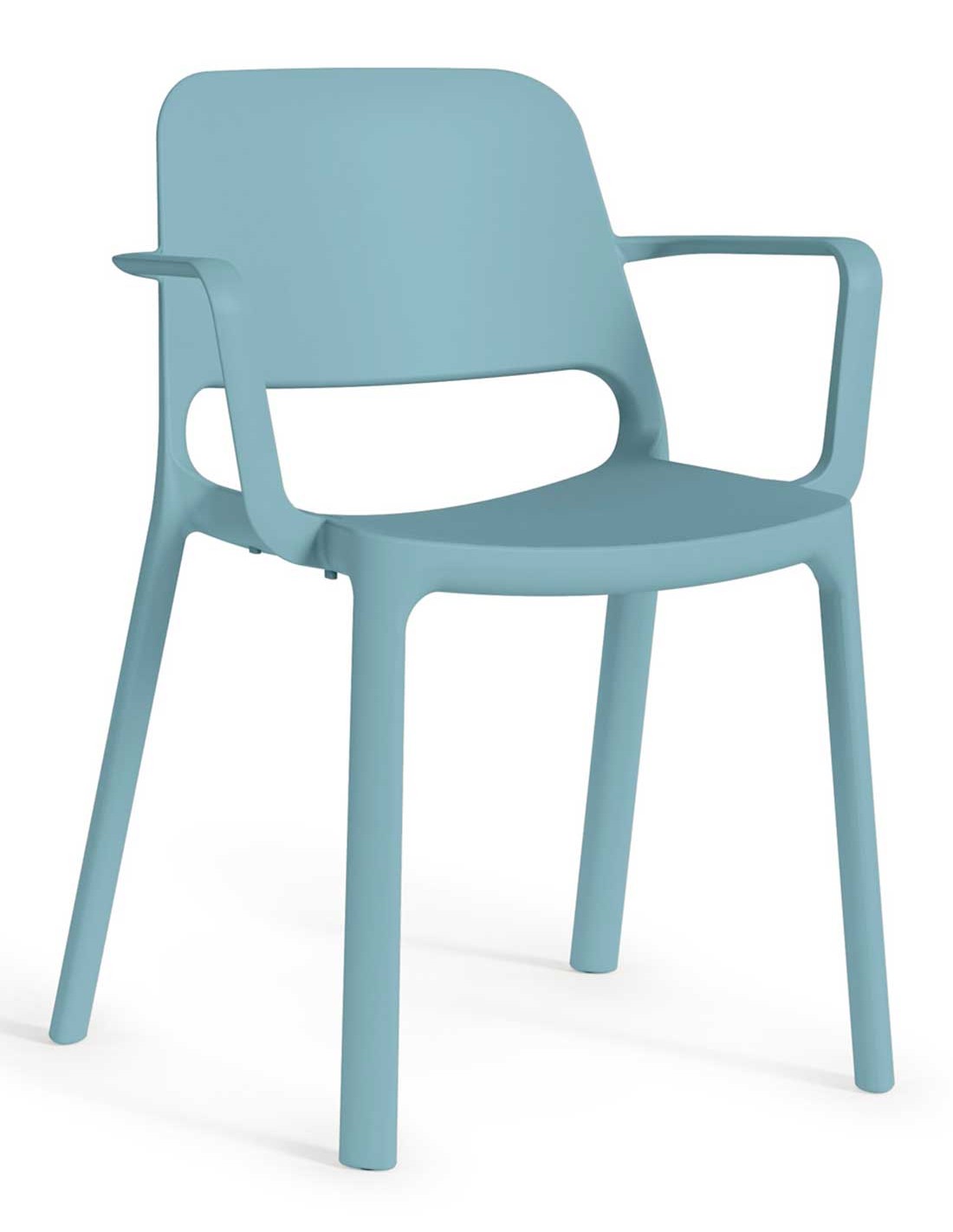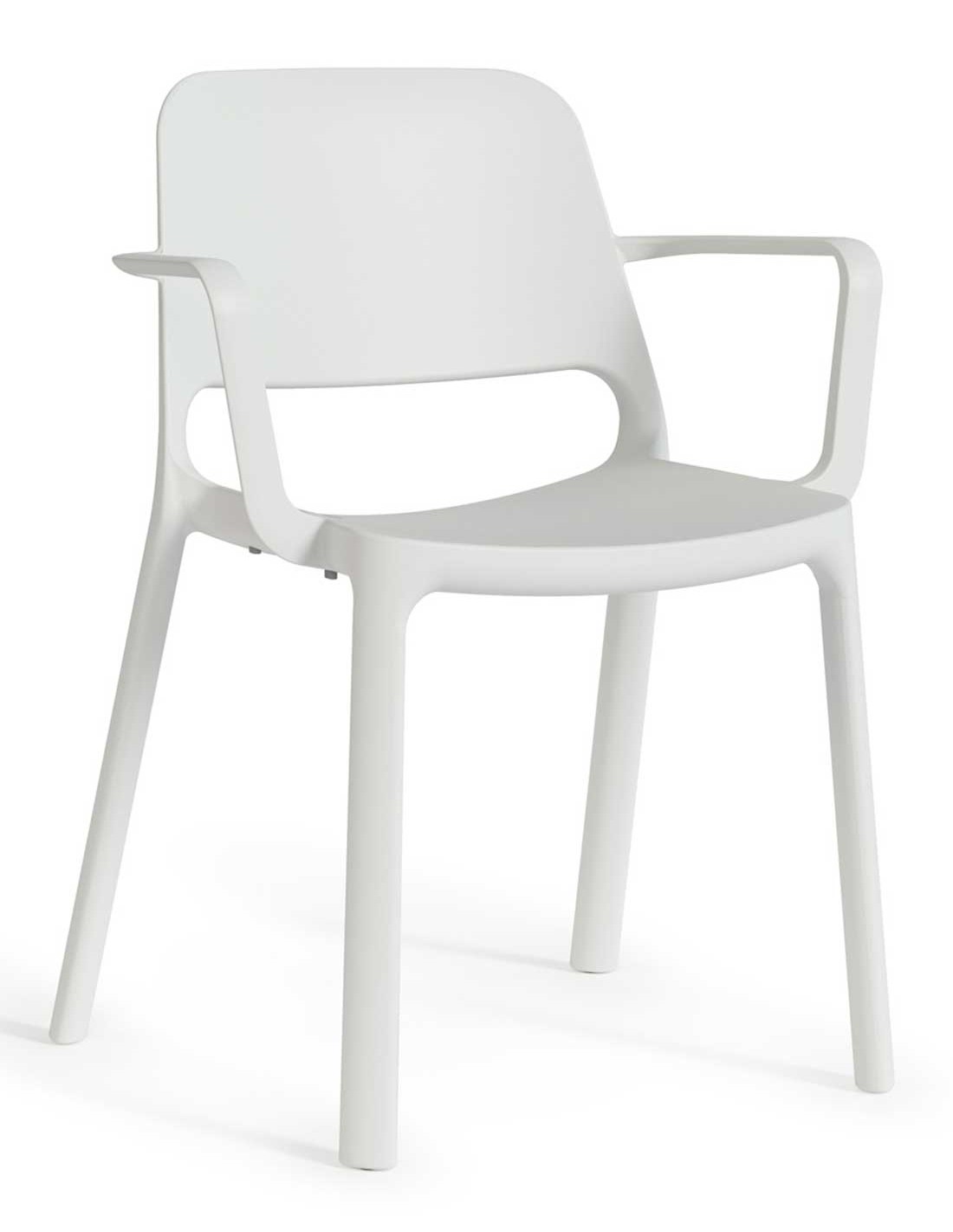 Silla fija apilable, con o sin brazos. Fabricada en polipropileno inyectado con fibra de vidrio de una sola pieza.