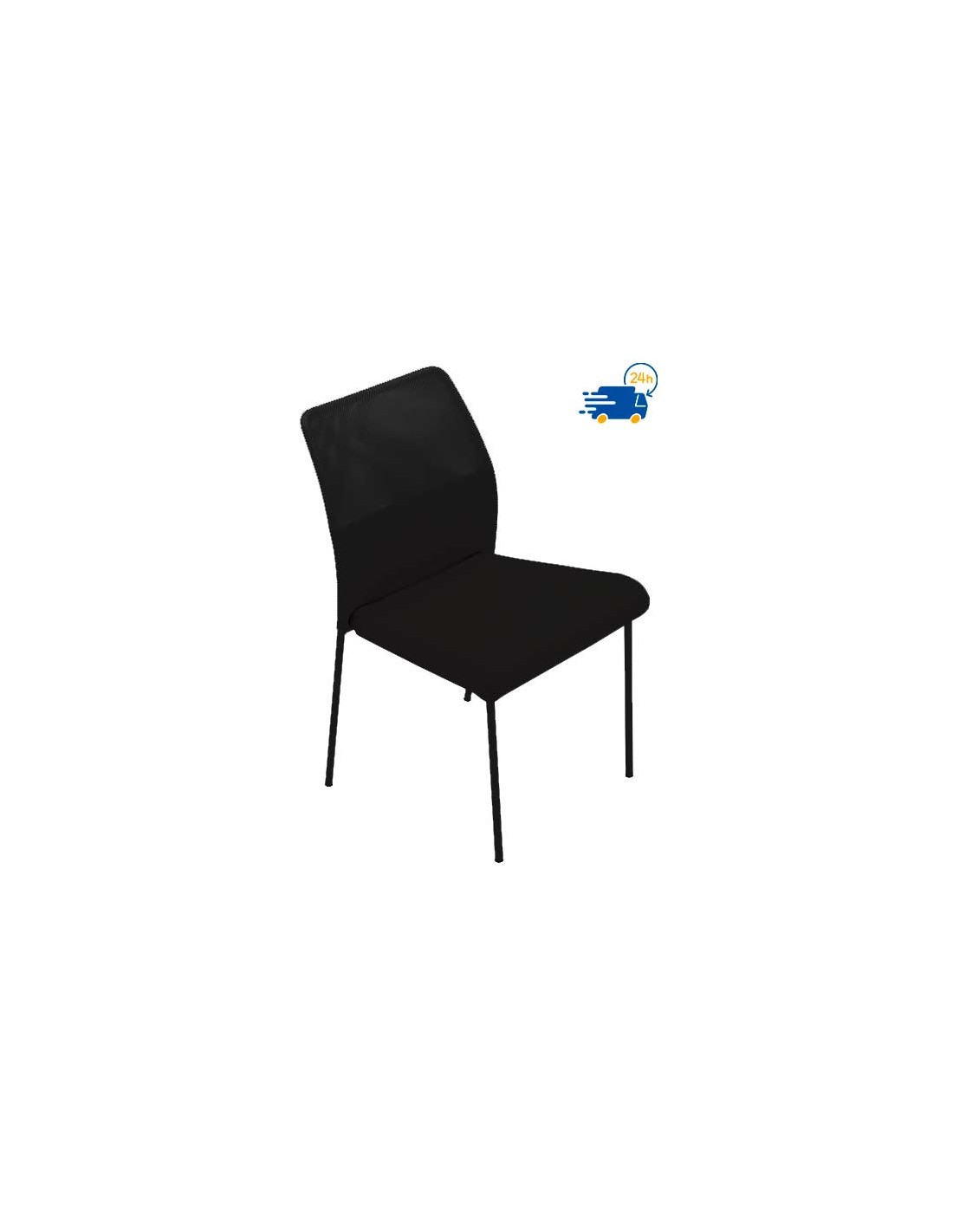 Estructura en pies de tubo redondo 18 x 1,5 mm, pintura en epoxi negro. Respaldo de malla negra. Asiento tapizado de gomaespuma de 40 kg/m3 extrafuerte. Brazos fijos de polipropileno negro. Tacos antideslizantes negros de polipropileno.