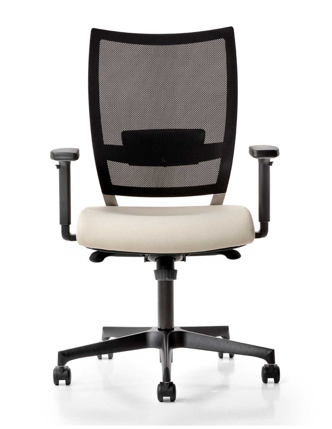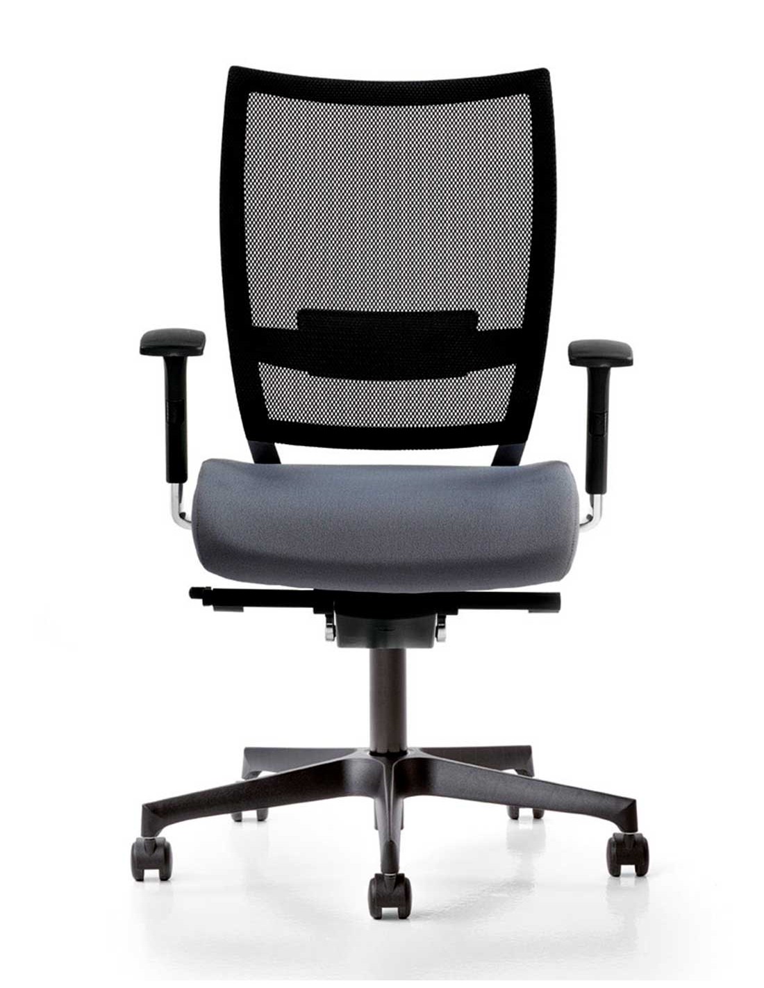Regulación del apoyo lumbar. Asiento tapizado sobre espuma de poliuretano de alta densidad. Mecanismo sincronizado con multiparada con regulación de intensidad.