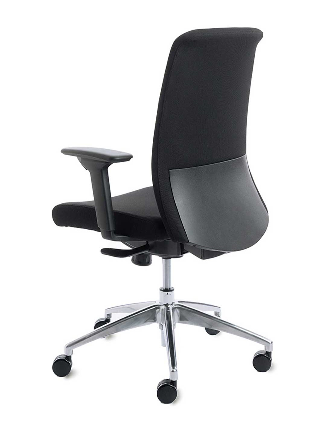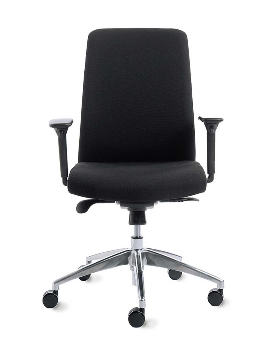 Silla móvil con ruedas para despacho. Tapizada en tela ignífuga. Interior de espuma inyectada. Base de aluminio y robusto mecanismo sincro. Regulación de la altura y el balanceo. Regulación de la profundidad del asiento. Incluye brazos regulables de serie.