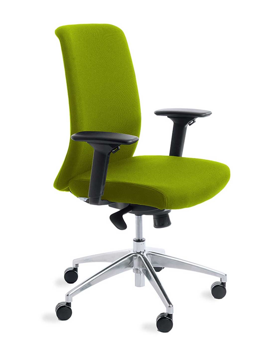 Silla móvil con ruedas para despacho. Tapizada en tela ignífuga. Interior de espuma inyectada. Base de aluminio y robusto mecanismo sincro. Regulación de la altura y el balanceo. Regulación de la profundidad del asiento. Incluye brazos regulables de serie.