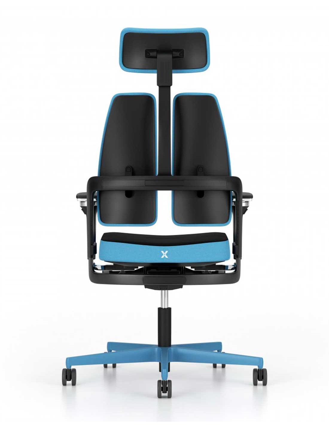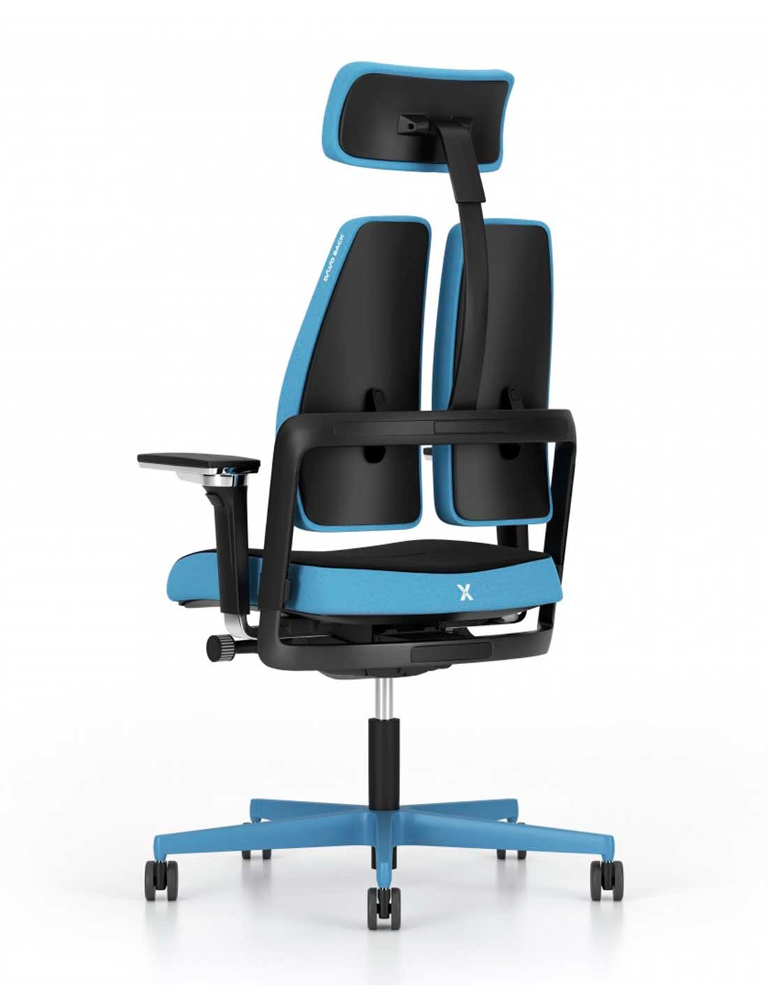 Silla de trabajo ergonómica, de alto diseño, con mecanismo X-MOVE en el respaldo, que acompaña el movimiento y sincro con traslación en el asiento
