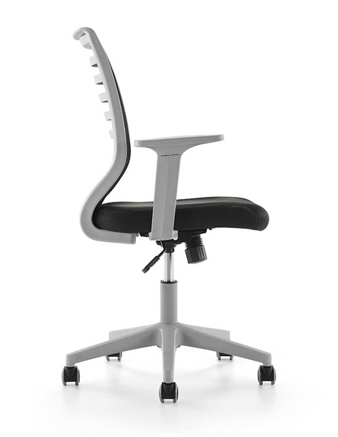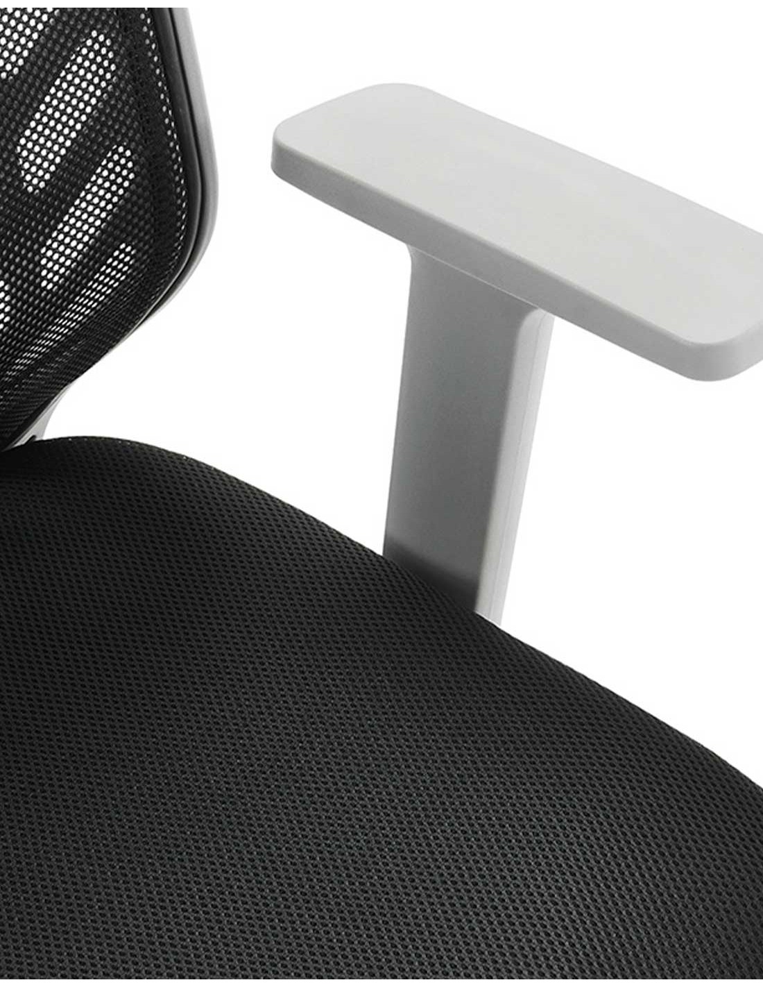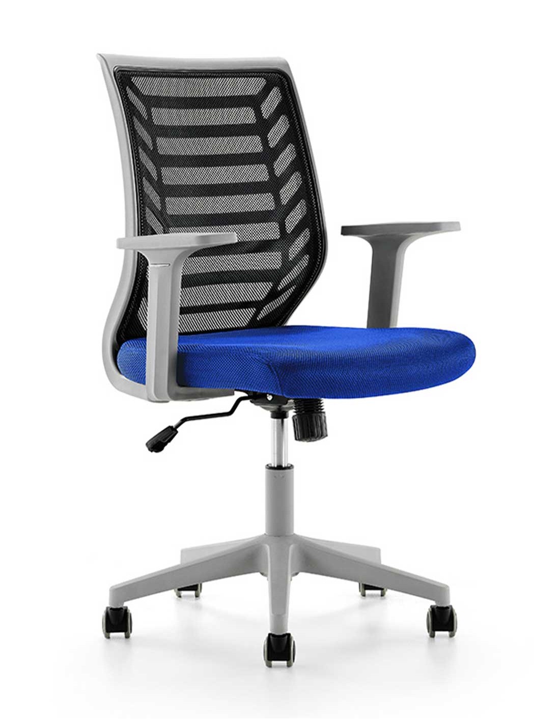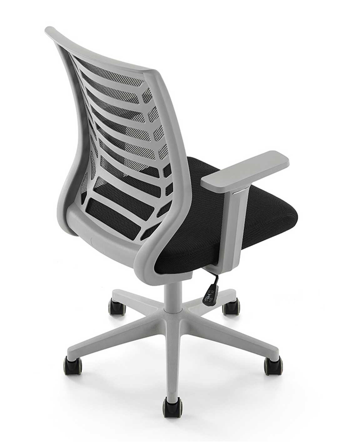 Silla de oficina operativa con asiento tapizado con tela ignífuga sobre interior de espuma inyectada, respaldo inyectado en polímero técnico tapizado con malla. Base en polímero técnico y robusto mecanismo basculante para un uso diario. Brazos regulables de serie. Admiten ruedas de parquet RD-917.