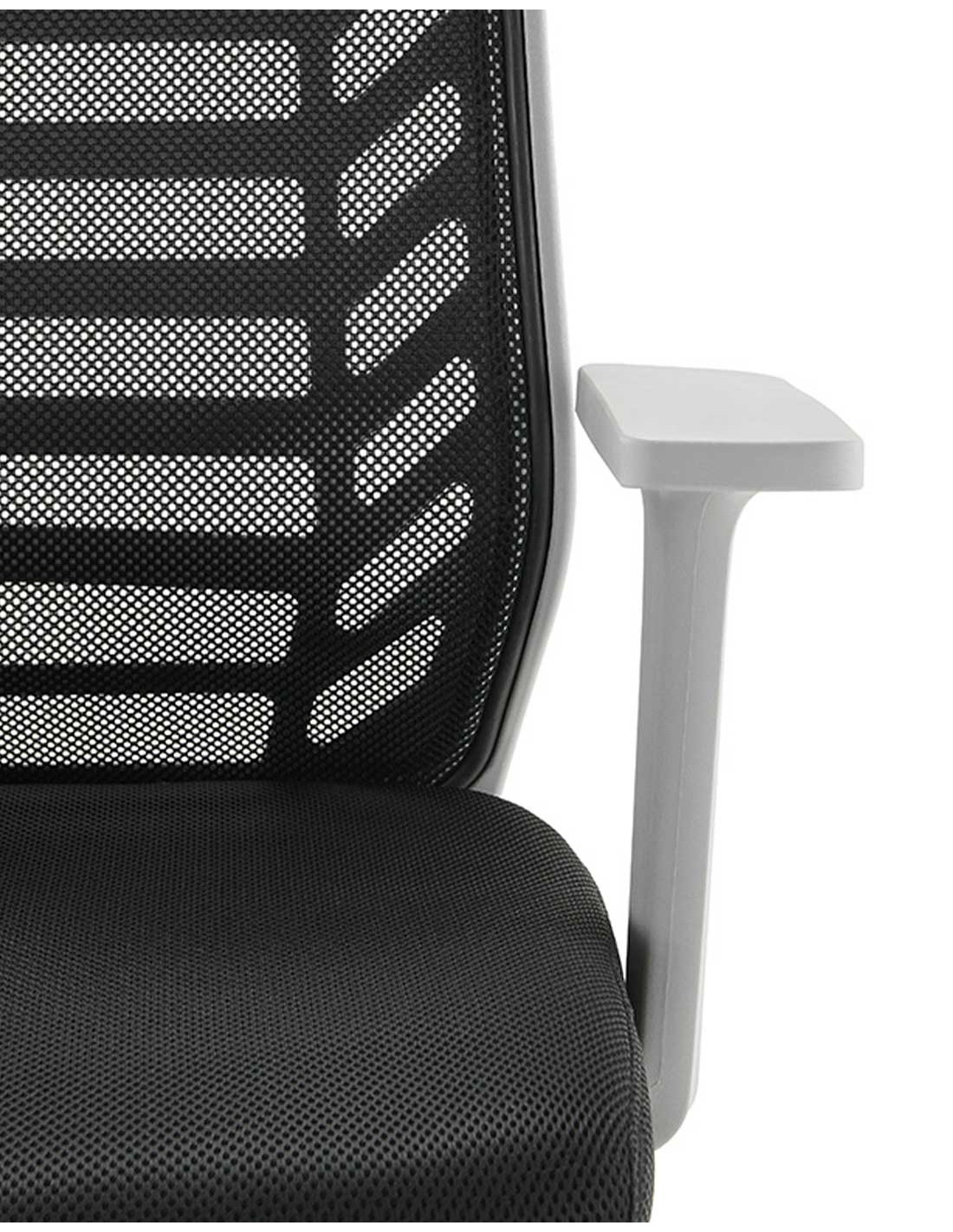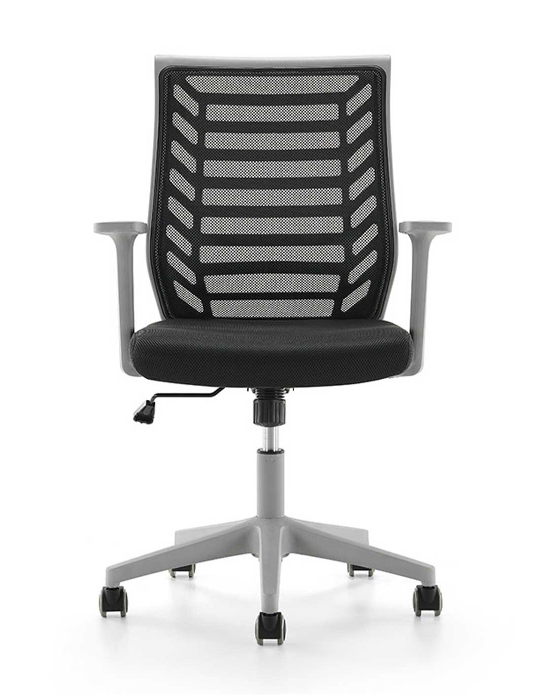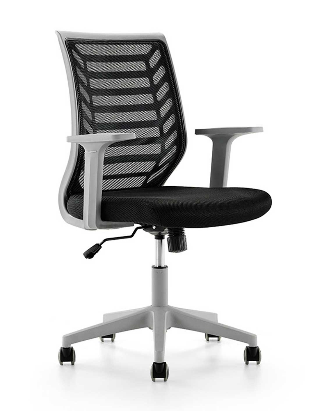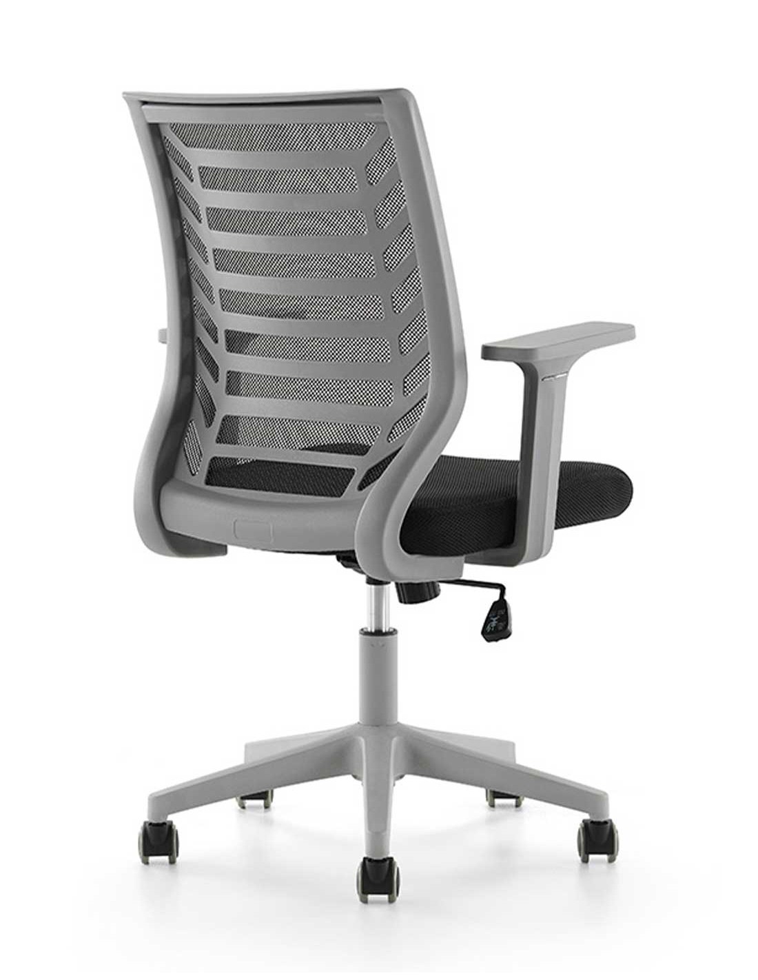 Silla de oficina operativa con asiento tapizado con tela ignífuga sobre interior de espuma inyectada, respaldo inyectado en polímero técnico tapizado con malla. Base en polímero técnico y robusto mecanismo basculante para un uso diario. Brazos regulables de serie. Admiten ruedas de parquet RD-917.