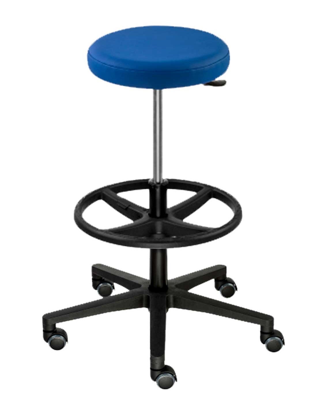 · Asiento de elastómero negro antideslizante · Giratoria · Elevación a gas · Base nylon negro con aro apoyapies de nylon regulable · Tapones a suelo antideslizantes · Altura mínima 56 cm, máxima 80 cm (desde suelo a asiento) · Diámetro: 64 cm · Opcionalmente admite ruedas (mismo precio) · Peso 9 Kg / Volumen 0,17 m3 |